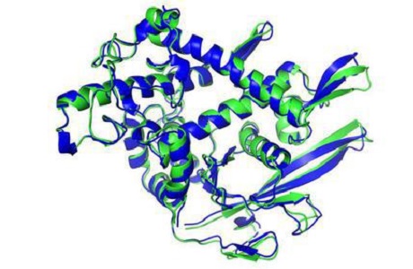 人工智能预测(蓝色)的蛋白质结构和实验测定(绿色)出来的几乎完全吻合。图片来源:美国《科学》杂志网站