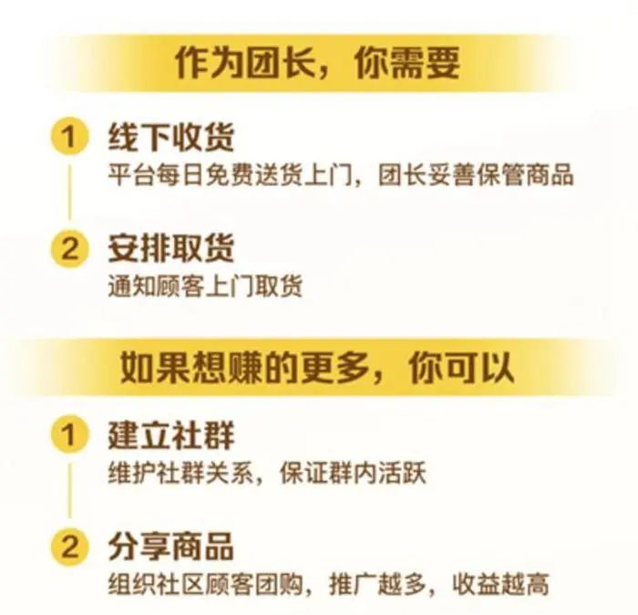 如,美团优选招聘团长页面显示,作为团长,你只需要线下收货,安排送货就行,即平台每日免费送货上门,团长妥善保管,然后通知消费者上门取货。“这简直就是坐等收钱的生意。”有网友如此评价。