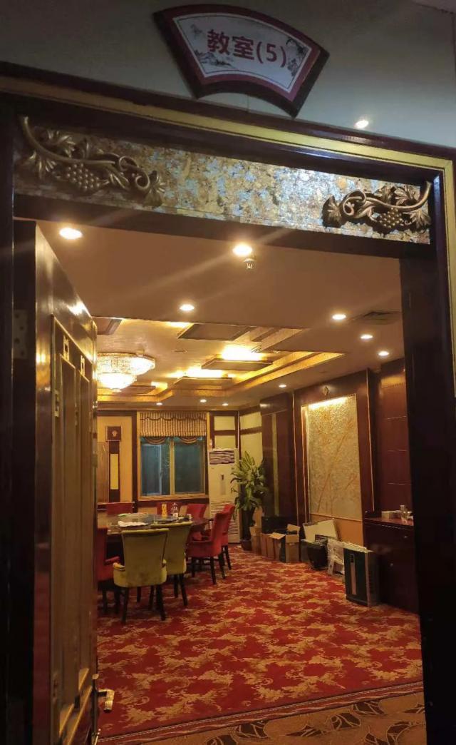 学生们发现,上课期间,酒店还会同时被租用给企业做为培训场地。于是,学生们不得不一边围着酒店大堂内的圆桌子上晚自习,一边忍受着隔壁飘来的阵阵菜香。