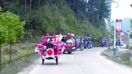 “现在婚礼都不提倡大操大办,公公务农了一辈子,老公提出来用农耕机做迎亲车队的时候,我马上就答应了。”不到几天的功夫,6台农耕机在他们的装扮下生动浪漫了起来。车头的大红花、车身的彩色气球、车尾的彩色飘带,每一处的细节都在“倾诉”着两位新人的幸福。