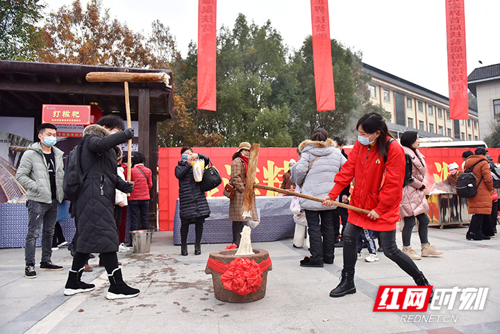 游客现场体验打糍粑活动。