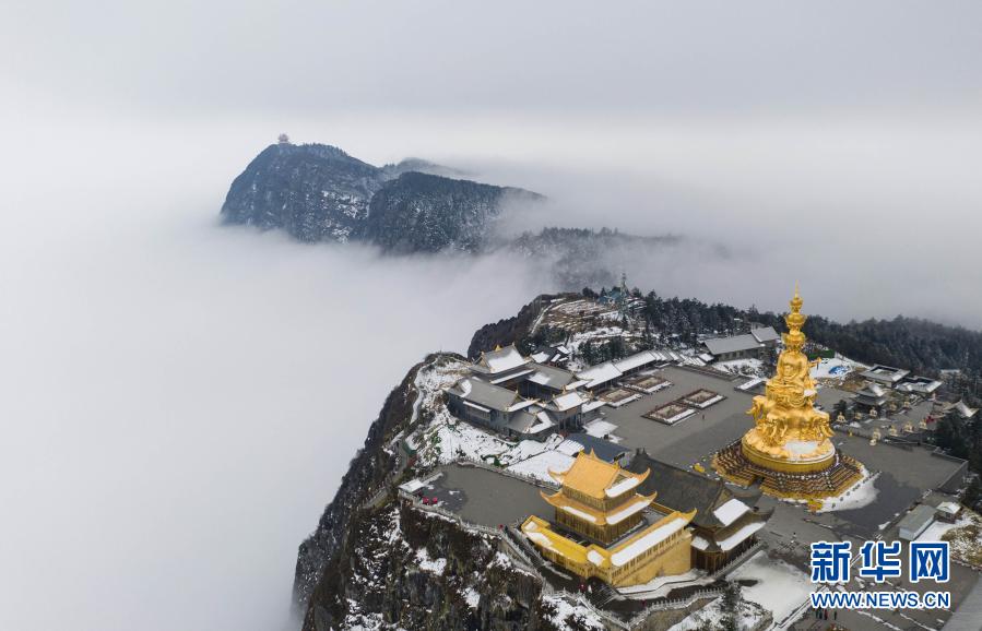 俯瞰云海中的峨眉山金顶和万佛顶(12月13日摄,无人机照片)。12月12日,第22届峨眉山冰雪温泉节开幕,将持续到明年2月。据悉,今年气温低、雪期早、雪量大,雾凇、树挂等冰雪奇观悉数登场,雷洞坪滑雪场也开始接待游人。新华社记者 江宏景 摄