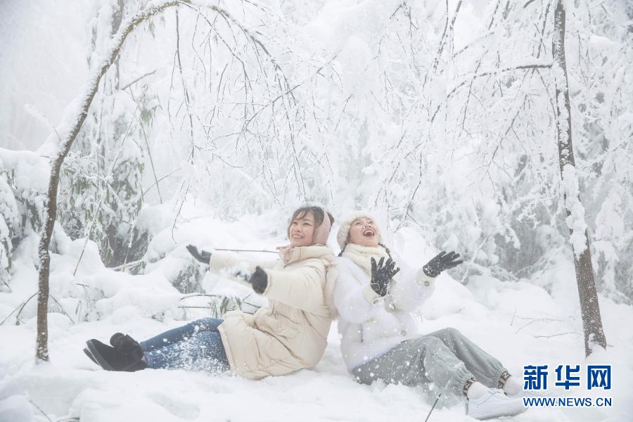 12月12日,两位游客在峨眉山冰雪中嬉戏。12月12日,第22届峨眉山冰雪温泉节开幕,将持续到明年2月。据悉,今年气温低、雪期早、雪量大,雾凇、树挂等冰雪奇观悉数登场,雷洞坪滑雪场也开始接待游人。新华社记者 江宏景 摄