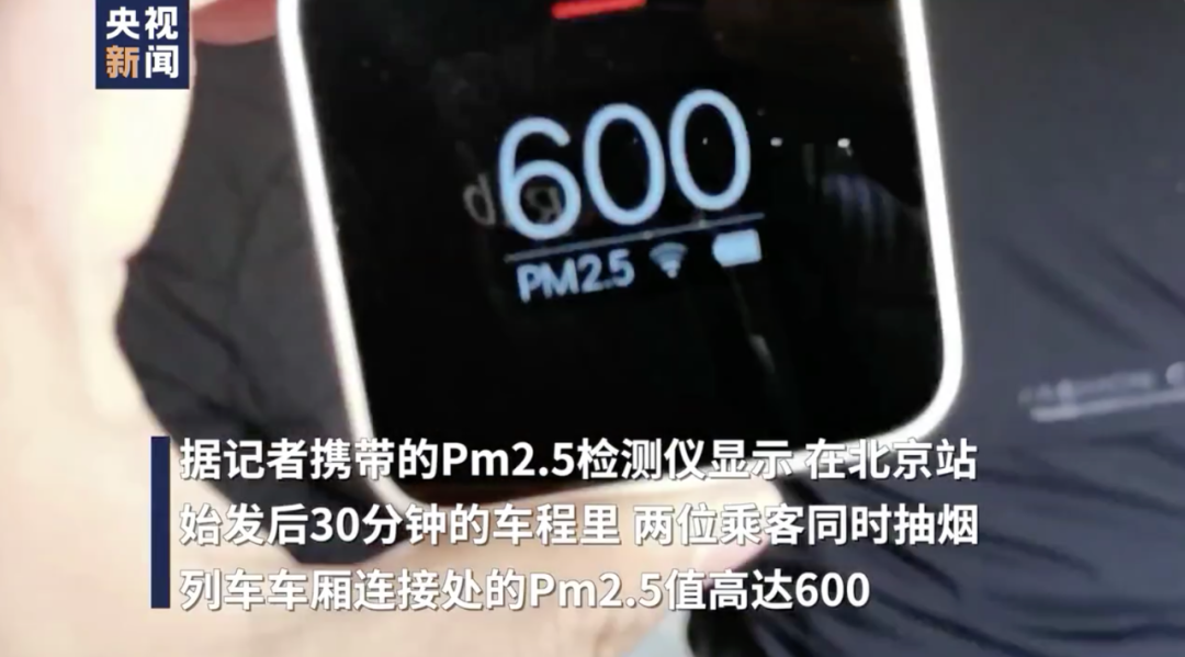 在北京站始发后30分钟的车程里,车厢连接处先后有八位乘客前来吸烟。据PM2.5检测仪显示,两位乘客同时抽烟时,列车车厢连接处的PM2.5值高达600。