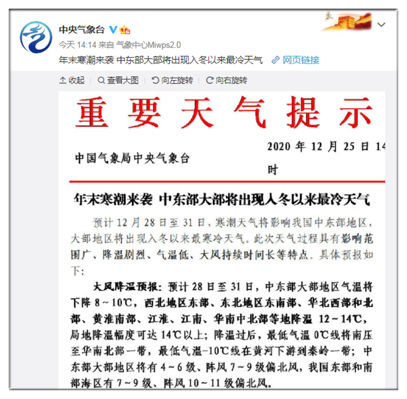 预计12月28日至31日,这股寒潮将自北向南横扫我国大部,带来“速冻式”降温和混合式雨雪,这将是今冬来影响我国的最强寒潮过程。
