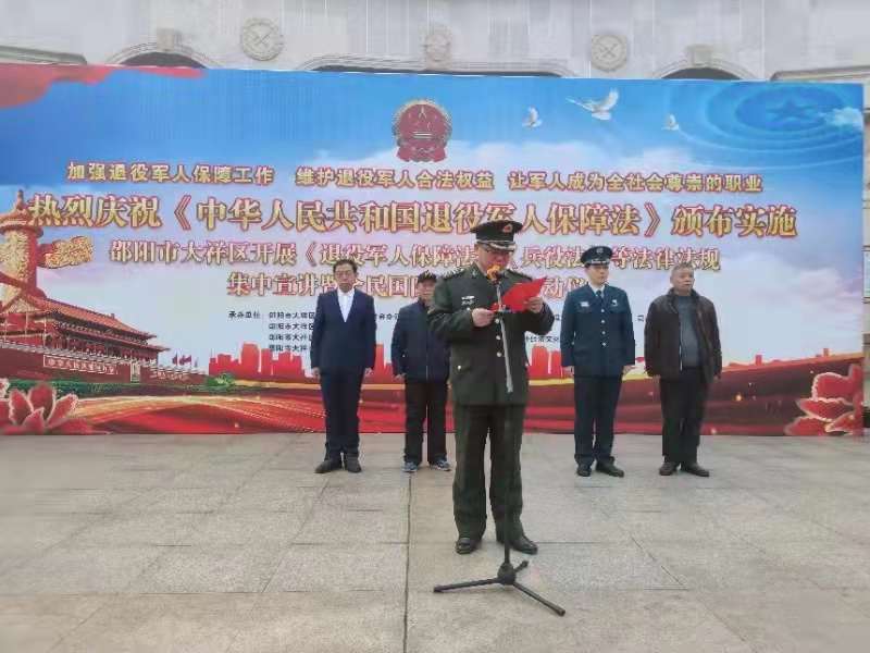 大祥融媒讯: (通讯员 黄明利 )为了加强退役军人保障工作,维护退役军人合法权益,让军人成为全社会尊崇的职业,鼓励有志青年积极投身国防建设。12月25日上午,邵阳市大祥区开展了《退役军人保障法》《兵役法》等法律法规集中宣讲暨全民国防教育活动。