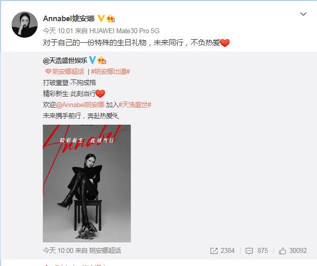 提到姚安娜,不少人心中还是会带着一个问号,毕竟当下其在娱乐圈的知名度还是“查无此人”。但说到她的另一个身份——华为创始人任正非的二女儿,人们才会发出一声恍然大悟的“哦”。在天浩盛世娱乐的官微消息发出后,姚安娜也转发了该微博,写到“对于自己的一份特殊的生日礼物,未来同行,不负热爱”,也宣告了进入一个新的人生阶段。