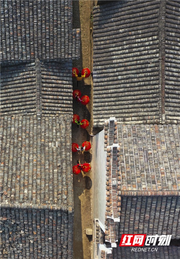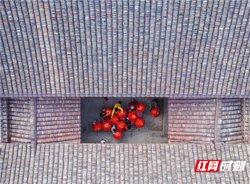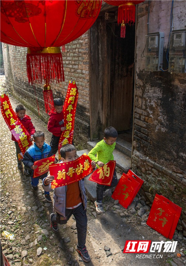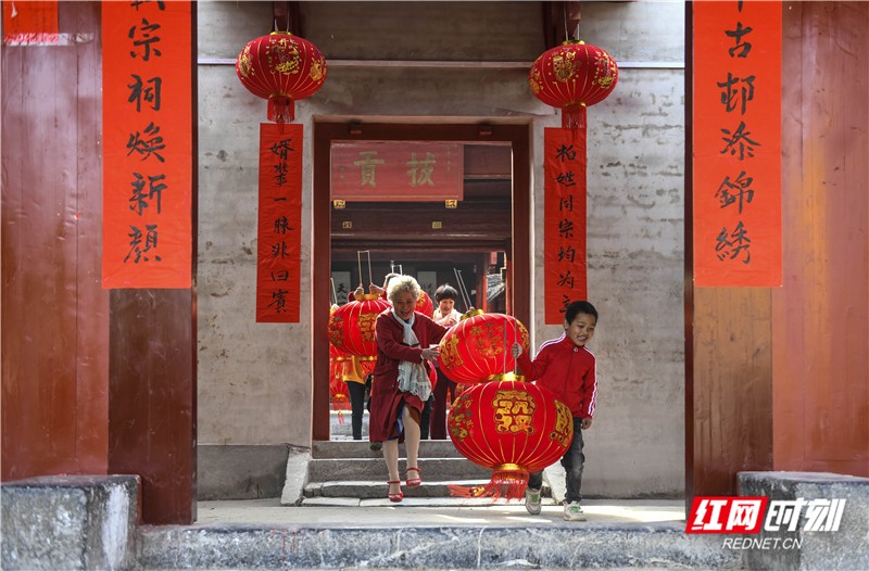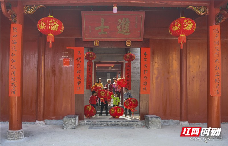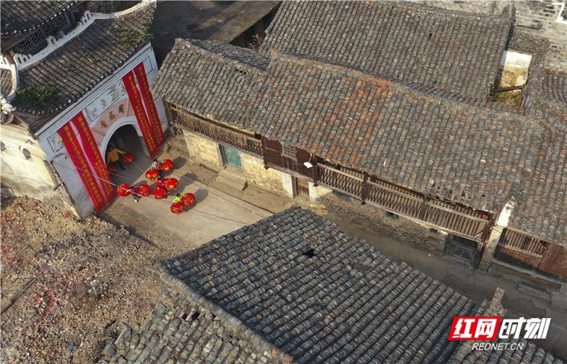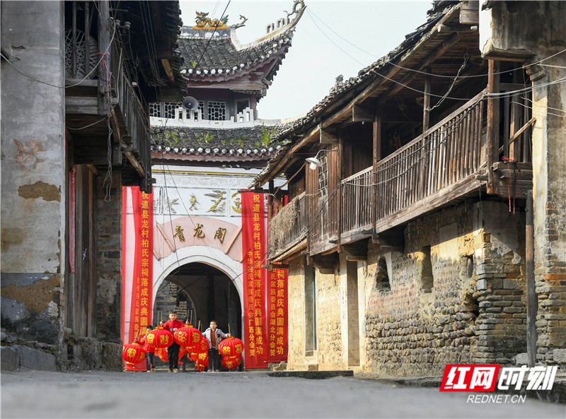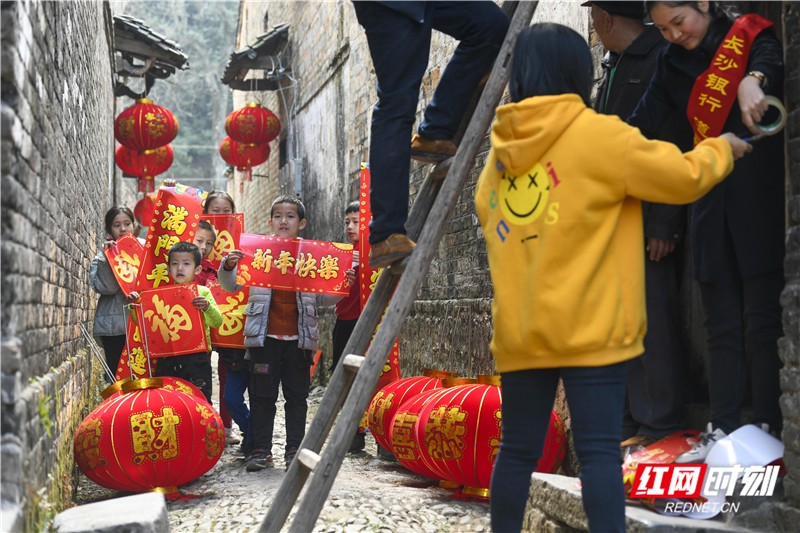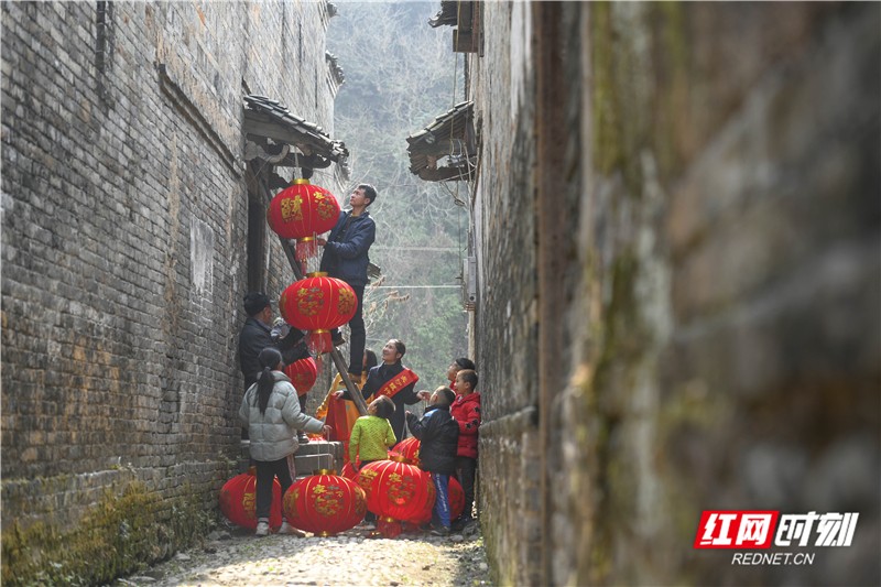 2021年1月31日,湖南省永州市道县乐福堂乡龙村,文化志愿者与村民一起挂灯笼。春节临近,当地文化志愿者走进龙村,为村民挂灯笼、贴春联,张灯结彩,大红灯笼挂满村里的各条古巷,年味十足。龙村是湖南省永州市迄今保存较为完整的古建筑群之一,2019年被列入中国传统村落第五批名录。该村传统建筑保存完好,总面积达到61775平方米,50%以上为明代建筑,35%为清代建筑,15%为民国重修建筑。近年,道县将人居环境整治和传统村落保护结合起来,科学开发利用古村,促进乡村振兴。
