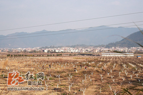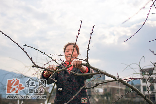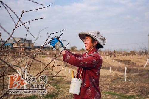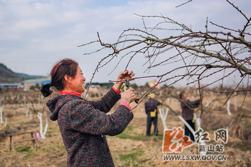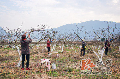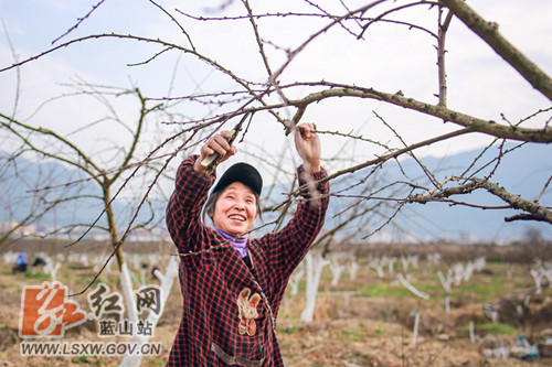 果园内种植葡萄、桃树、李树等果树400余亩,工人们利用冬闲时间修去多余的交叉枝、病虫枝,使树枝变得疏密均匀、树冠齐整,有利于改善果树的透光、通风性,促进果树的生长发育,提高来年果实品质。