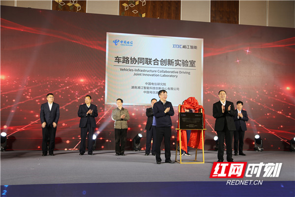 在签约仪式现场,在中国电信集团及湘江新区见证下,中国电信研究院、湘江智能、中国电信湖南公司三方共同揭牌,宣告成立“车路协同联合创新实验室”。在湖南(长沙)创建国家级车联网先导区的发展背景下,三方将依托各自优势,在车联网先导区5G-V2X及新基建规划建设、车联网技术研发、车联网示范场景打造、车联网试商用运营与维护四个方面展开深度合作,通过5G通信与汽车智能网联的共同作用,实现车联网产业跨行业融合。