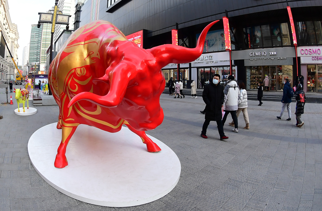 在辽宁沈阳中街步行街,市民观看福牛艺术雕塑(2021年2月1日摄)。新华社记者 杨青 摄