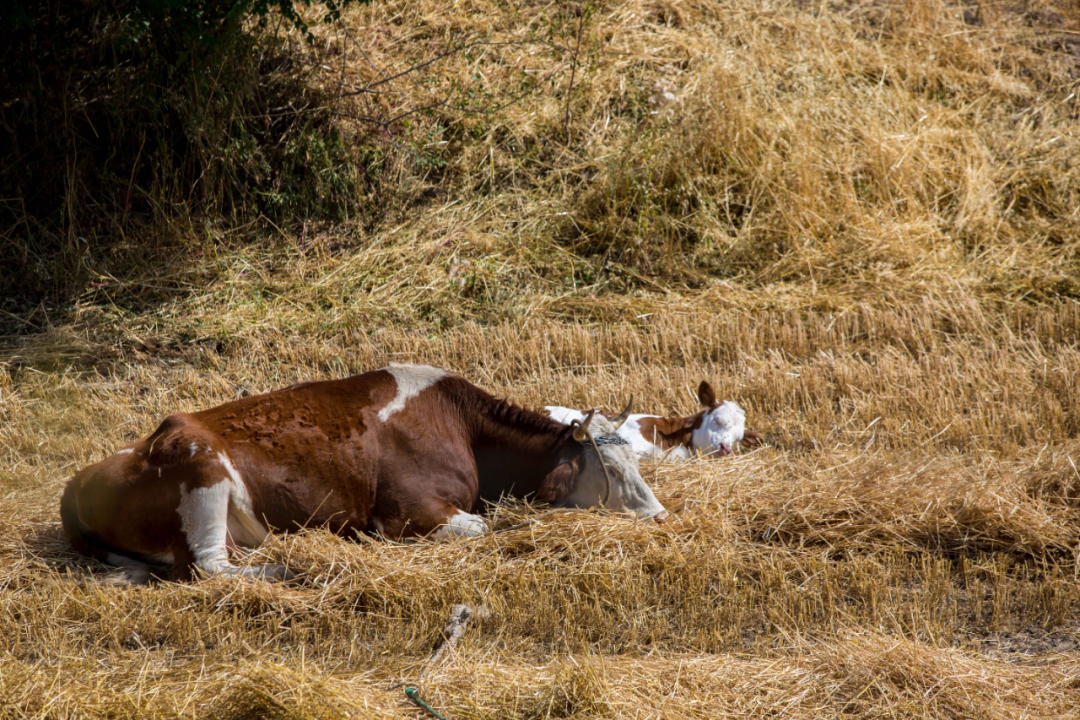 在新疆江布拉克景区内,两头牛躺在麦田里休憩(2017年9月10日摄)。新华社记者 李京 摄