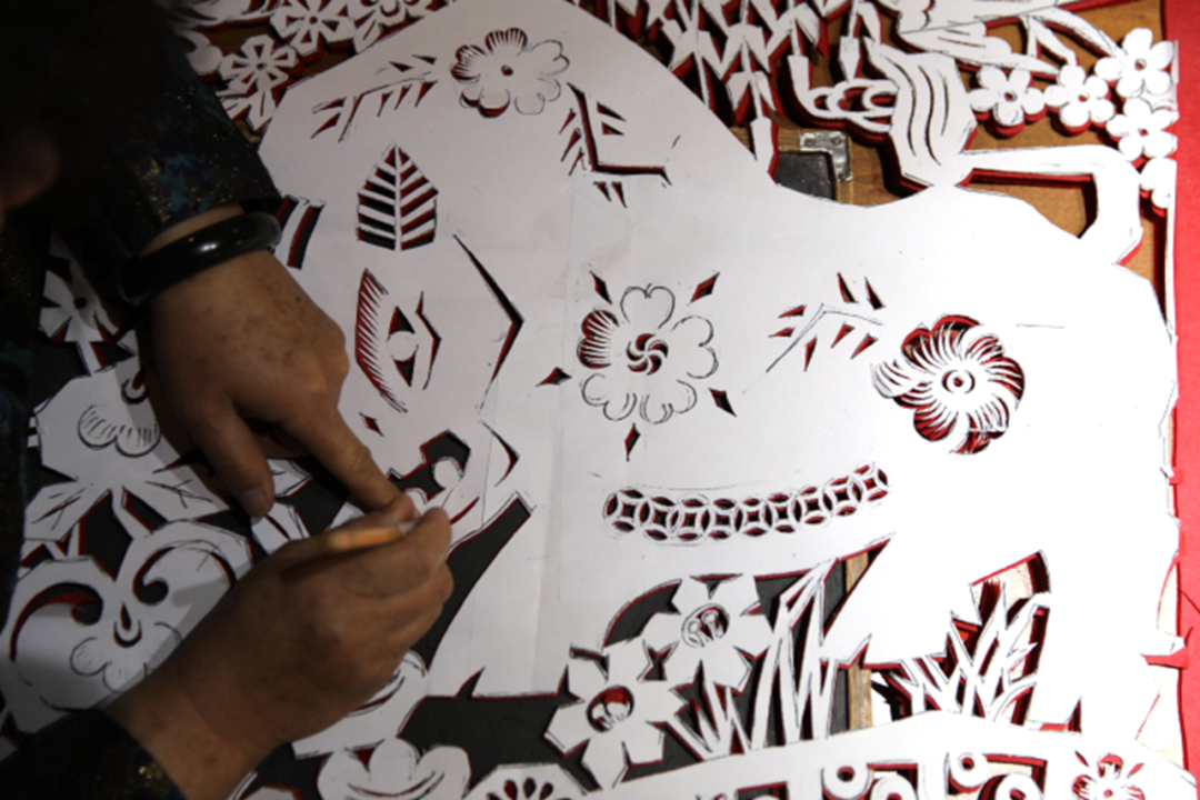 在河北承德市双桥区俊凤剪纸创作室,剪纸艺人石俊凤创作贺岁迎春生肖牛主题剪纸作品(2021年1月29日摄)。新华社发(刘环宇 摄)