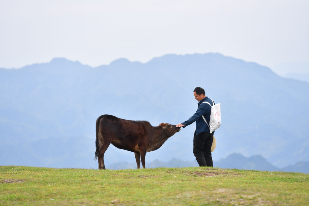 广西柳州市融水苗族自治县杆洞乡尧告村脱贫攻坚工作队员李义成在尧告村高山天然牧场了解牛的生长情况(2020年4月26日摄)。新华社记者 黄孝邦 摄