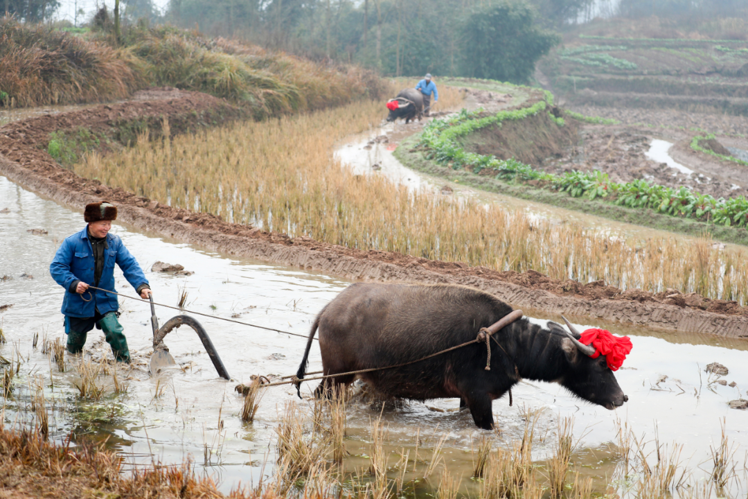 四川省华蓥市明月镇白鹤嘴村的农民在田间“犁春牛”(2021年2月2日摄)。新华社发(邱海鹰 摄)