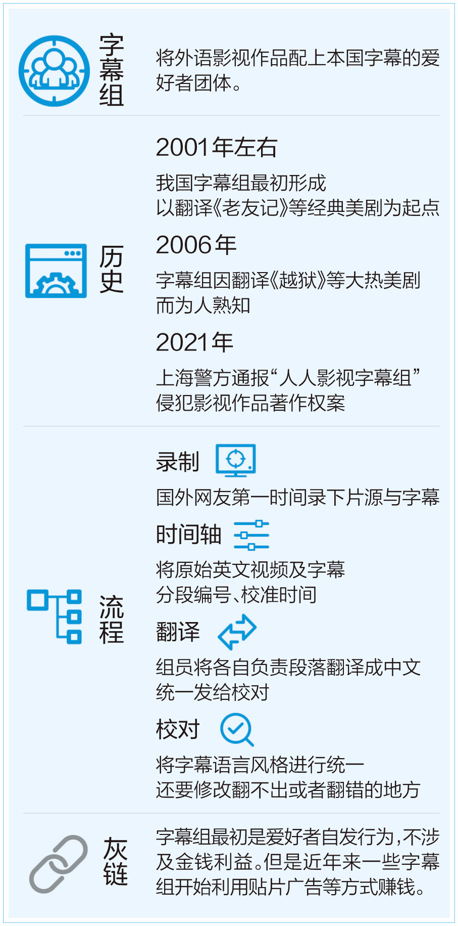 阿莱所在的字幕组是典型的大型字幕组操作作风,案发的人人影视被称为“宇宙组”也是因为它规模最大。而埃米所在的字幕组则属于“小破组”。