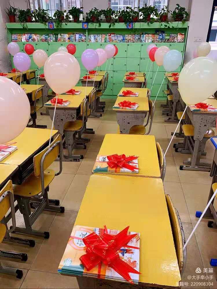 开学第一天,老师和家长们满怀欢喜,用五颜六色的气球让整个教室瞬间亮了起来。每一条红丝带系着一份期待,用最美的书陪伴孩子们“犇”向更好的自己。