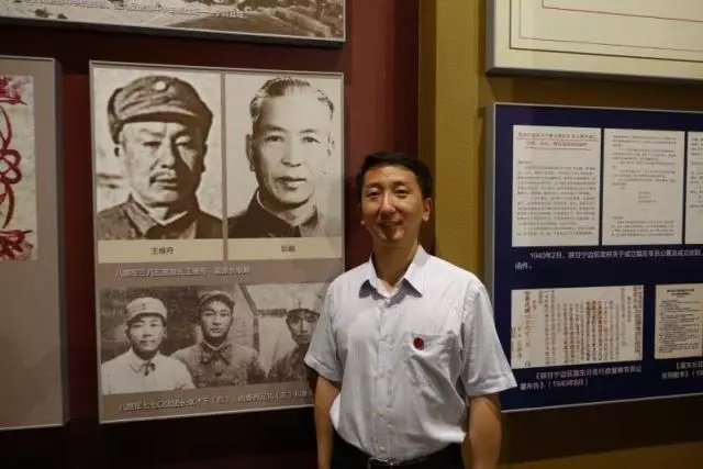2015年,耿巍在庆阳南梁革命纪念馆有关爷爷的展板前留影。