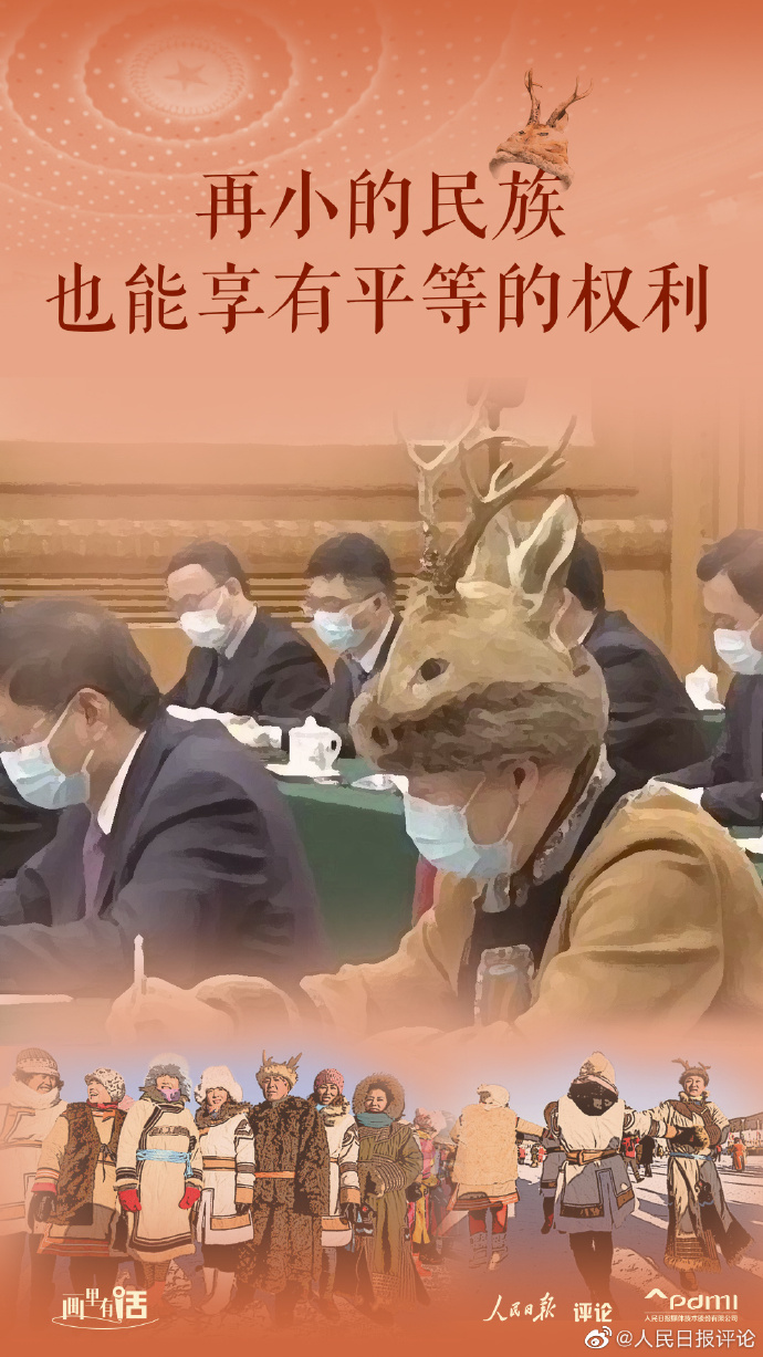 @人民日报评论 3月10日消息,这两天,一位头戴“小鹿帽”的人大代表火了,他是来自内蒙古鄂伦春族自治旗的代表代喜院,头戴的是鄂伦春族的特色头饰密塔哈,帽子上的动物造型并非鹿而是狍子。稍加留意,会发现两会上这样的特色服饰并不是独一份儿:阿昌族唯一的全国政协委员段明龙身着蓝色对襟服饰亮相,来自羌族的人大代表余绍容身着红衣、头戴花帽、佩戴银饰登场……这样的画面,让西方一些人的造谣抹黑言论不攻自破,也让人们在对比中看到“中国之治”的恒定价值。我国是一个多民族国家,民族平等是一贯原则。