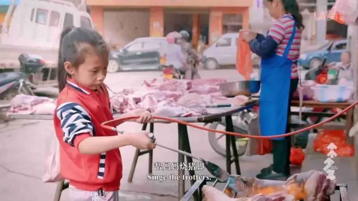 她熟练地帮妈妈切割猪肉,洗猪大肠,火烧猪脚……一年365天,只得一天休息时间。
