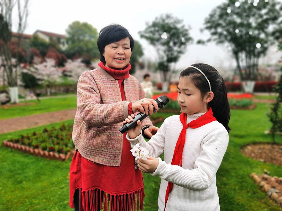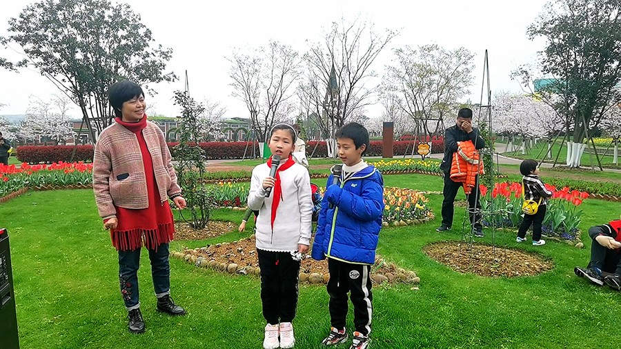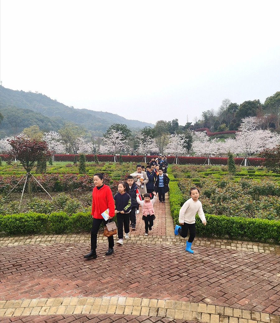 “小脚丫”实践课堂的学生们身处万千花谷,徜徉在花海中,以花为媒,诵诗词、赞百花。有学生拾起散落于草地上的樱花瓣,将它比喻美人仙子,唱颂“樱花落尽阶前月,象床愁倚薰笼。远似去年今日,恨还同。双鬟不整云憔悴,泪沾红抹胸。何处相思苦,纱窗醉梦中”;有学生感慨此时此景彷如置身于红楼梦中的元宵诗会,吟诵“山深未必得春迟,处处山樱花压枝。桃李不言随雨意,亦知终是有晴时”;还有学生干脆即兴起舞,来一回梦回唐朝“昨日雪如花,今日花如雪。山樱如美人,红颜易消歇”;吟诗赋歌的场面感染了前来赏花的游客,游客带着孩子们跃跃欲试,经典共传唱周恩来总理的《春日偶成》“樱花红陌上,柳叶绿池边。燕子声声里,相思又一年。”天真烂漫的孩子就是樱花一朵,在实践课堂中尽情绽放。