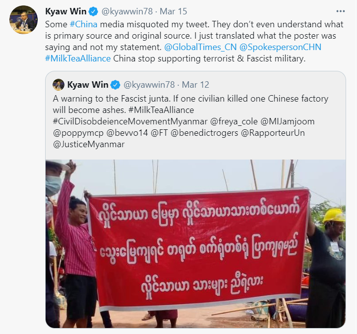 一个官方认证为“缅甸人权网络(BHRN)创始人兼执行总监”的推特账号“Kyaw Win”,在缅甸的中资工厂被当地暴徒打砸抢烧的前两天,曾发推威胁在示威过程中“(但凡)有一个平民被杀,就会有一家中国工厂化为灰烬”。在被《环球时报》揭露后,Kyaw Win很快辩解称“中国媒体错误引用了他的推文”,还表示他们“甚至不知道一手资料和原始资料是什么。我只是翻译了标语上的内容,这并不是我的声明。”Kyaw Win还专门在推文中@了《环球时报》的账号。