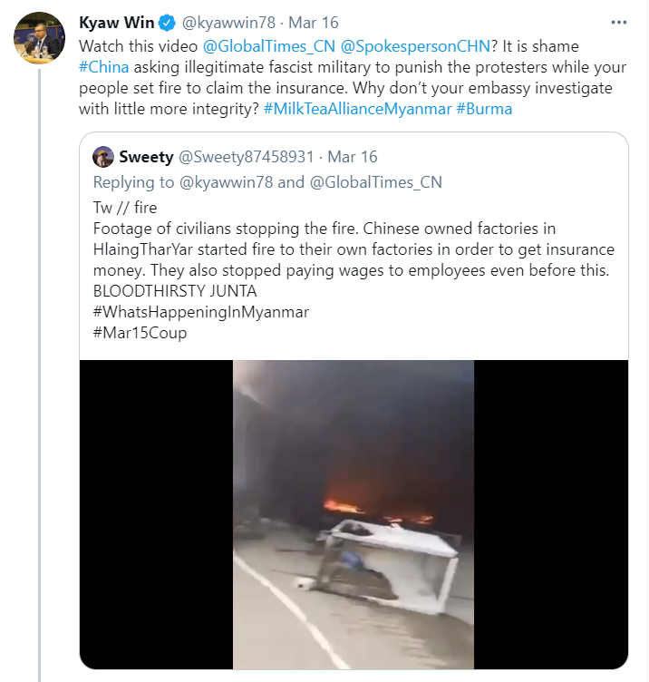 KyawWin当天转发了这段视频,并在配文中再次挑衅,他说:“请《环球时报》和中国外交部发言人看看这段视频,中国要求非法的‘法西斯军队’惩罚抗议者,而你们的人民却放火要求保险,这真可耻。你的大使馆为什么不诚实一点进行调查呢?”在这段推文后,KyawWin照旧加上了一个“缅甸奶茶联盟(#MilkTeaAllianceMyanmar)”的hastag。