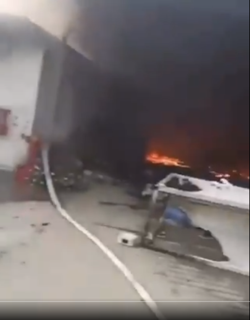 记者观看这段时长42秒的视频,该视频为手机拍摄,一座工厂的厂房正在燃烧,现场浓烟滚滚,有一条消防水带铺在地上。画面中不时有缅甸当地民众闪过,而视频拍摄者在不停用缅语大声喊叫。