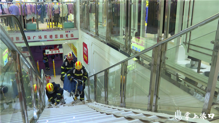 当天晚上七点,演练开始,现场模拟中央时代广场商场二楼和五楼因用电线路老化、顾客吸烟引起火灾,火势迅速向其他楼层蔓延,一名工作人员被困,区消防救援大队接到报警后紧急出动。到达“火灾现场”后,指挥员立即了解商场结构、火势规模,作出应急救援安排部署。
