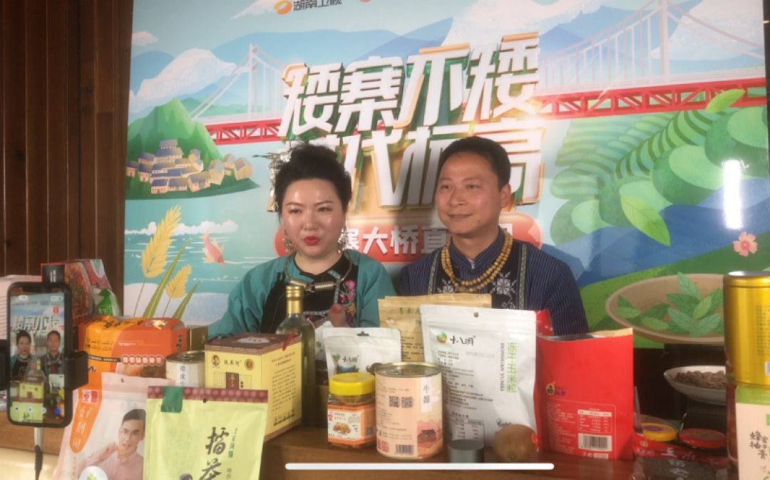 湘西州网红主播肖格格(左)和书腾(右)在芒果云超市直播间向网友推荐湘西擂茶。