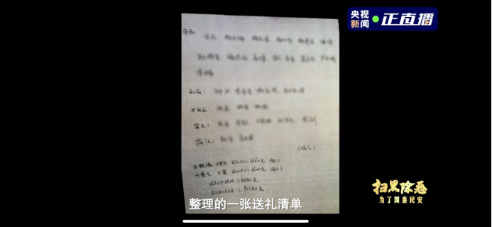 一张送礼清单,上面列满了公安、检察、文旅、工商、税务等部门公职人员名字。