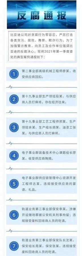 4 月 16 日,市值达 4729 亿元的新能源汽车龙头比亚迪在 " 廉洁比亚迪 " 公众号发布反腐通报,公布了 2021 年第一季度查处的典型案例,多名员工存在贪污腐败问题,主要涉及收受供应商回扣、与供应商人员打麻将、贿赂、开设赌场等。