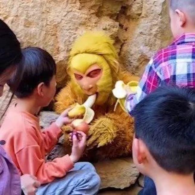 一工作人员在景区扮孙悟空与游客互动