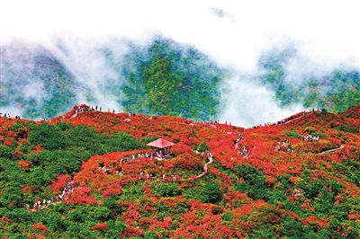 山风渐起,云雾未散。那一簇簇火红、一丛丛粉红、一团团浅紫,千娇百媚,与翠绿山林交相辉映。无边胜景一时令人趋之若鹜。