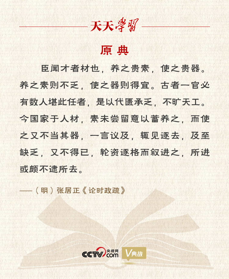 明嘉靖二十八年(1549年),时年25岁的翰林院庶吉士张居正向嘉靖皇帝上《论时政疏》,提出改革政治的主张。《论时政疏》列举了当时政治危机中最迫切的宗室、人才、官吏、外患、财政五大问题。其中关于人才问题,张居正指出,“才者,材也,养之贵素,使之贵器”。意思是人才就像木材一样,培养时贵在保持其本性,使用时贵在发挥其特长。