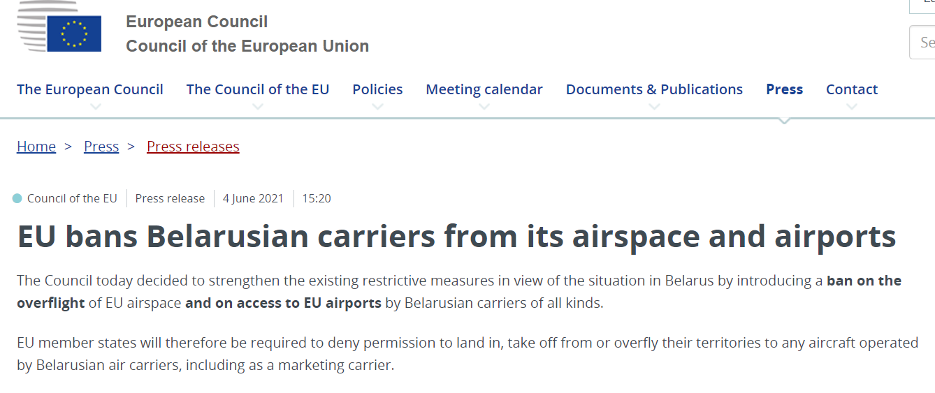 当地时间6月4日,欧洲理事会发表声明称,成员国正式批准禁止白俄罗斯航空进入欧盟领空,同时禁止其班机降落在欧盟各成员国机场。欧盟还要求成员国拒绝白俄罗斯航空起飞、降落等许可。禁令将从当地时间6月4日午夜开始实施。