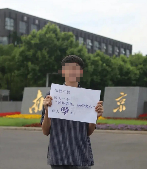 所有学生招牌中都有一个字加粗,这些加粗的字连起来组成了“我在南京大学等你”。