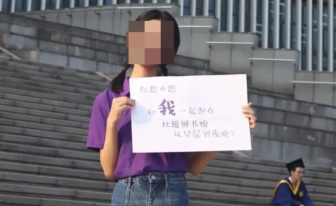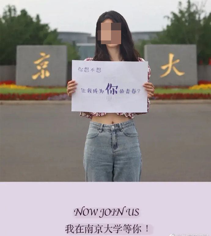 美女站在图书馆前,举着“你想不想让我成为你的青春”“你想不想和我一起泡在图书馆,从早晨到夜晚”的招牌,呼吁大家报考,今天(8日),南京大学因为这样一组招生宣传照引发争议,有网友认为这是在物化女性,也有网友认为没必要上纲上线。目前,南京大学官微已将该帖子删除。