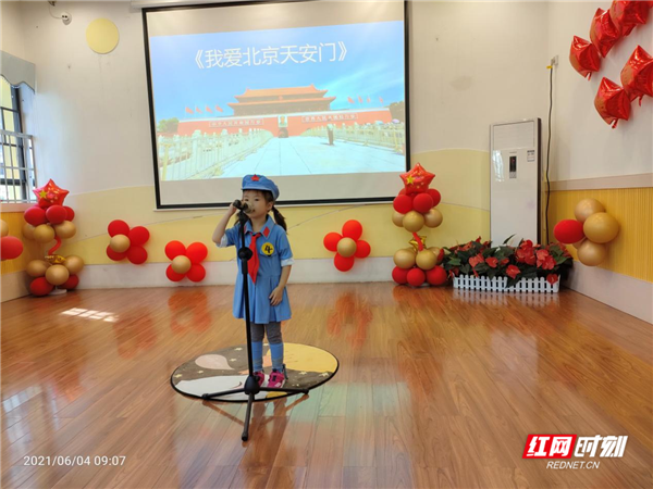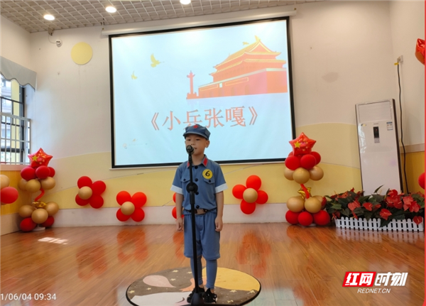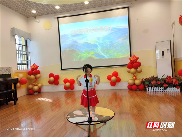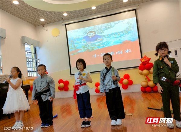 小班组以红色儿歌、诗歌为主要表演形式。有儿歌《祖国妈妈真漂亮》、《我爱北京天安门》、《闪闪的红星》、《中国娃说中国话》,七言律诗《长征》、故事《大英雄夏明翰》六个作品。别看他们年龄小,但是上场个个落落大方,故事讲述流畅清晰,还能用适当的动作表现故事中不同的情绪。他们用纯净的童声表达对祖国最诚挚的感情,赢得在场观众阵阵掌声。