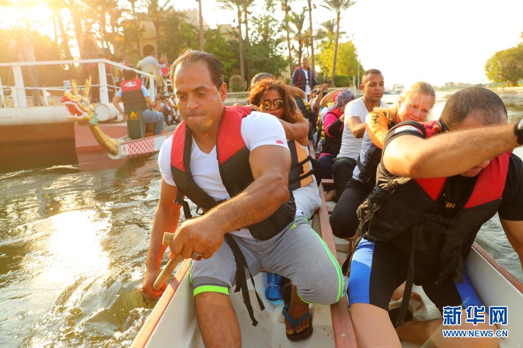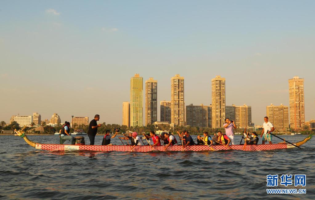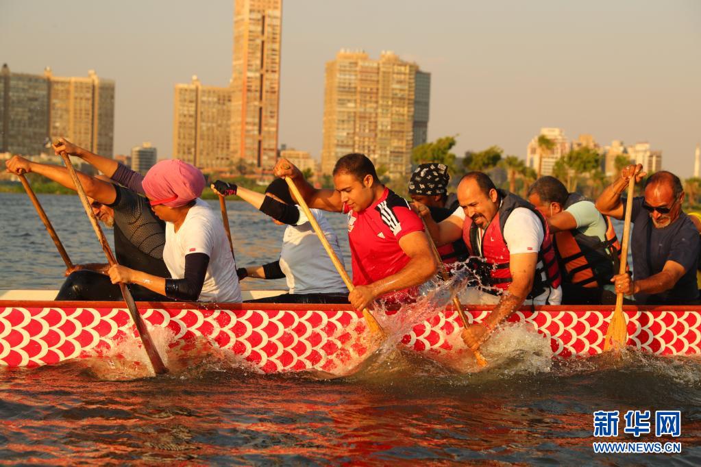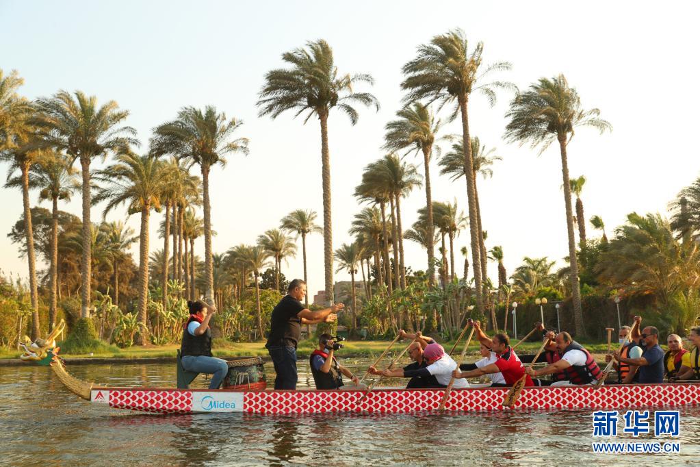 6月14日,在埃及首都开罗,埃及龙舟文化体验基地的龙舟队在尼罗河上进行龙舟竞赛。