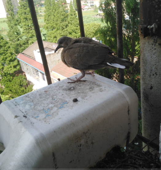 4号,小斑鸠可以动弹了。瞧瞧,小斑鸠一天一个样,看着长大,12号起,小鸟长成了大鸟,身体占满了鸟巢,鸟妈妈就不来住了,只是白天来喂食,14号鸟妈妈与小鸟共度端午节。
