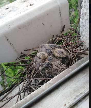 过了好几天,发现窝里少了一枚蛋。我原以为这次孵化会有四胞胎,结果却只有两只,之前的那两颗鸟蛋停止过孵化,又经历了暴晒,应该是坏了。还好,6月1日一早,两只可爱的小斑鸠破壳过六一儿童节了。瞧瞧,尚有一瓣蛋壳还挂在身上呢。