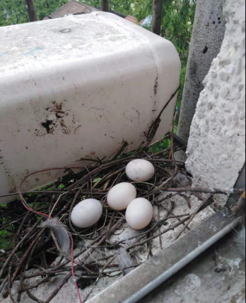 7号下午,家里来人置换热水器,李医生坐在客厅看电视,一个不留神被贪心的安装师傅捉住母鸟,挣扎中抖落了许多羽毛,幸好被及时救下,发现时还不算太晚,没有伤到要害,母鸟得以逃生。这时才发现这两个正在孵化中的蛋,不然,母鸟一直安心孵化,是不会离开鸟窝的。直到安装师傅离开,母鸟有所察觉,才放心飞了回来。