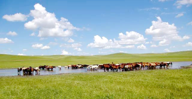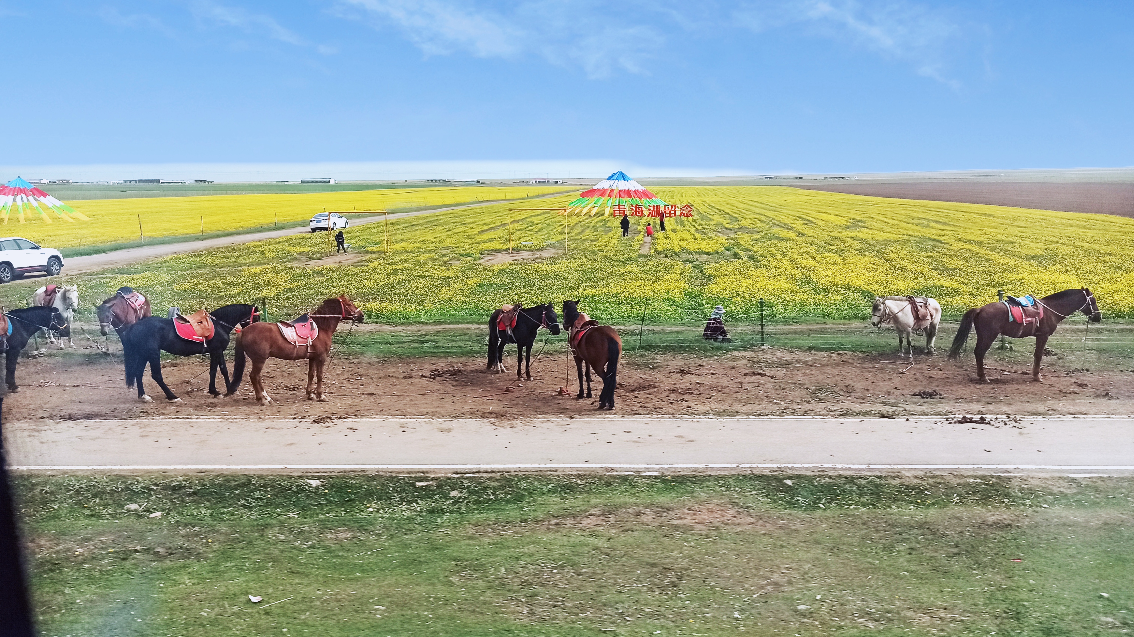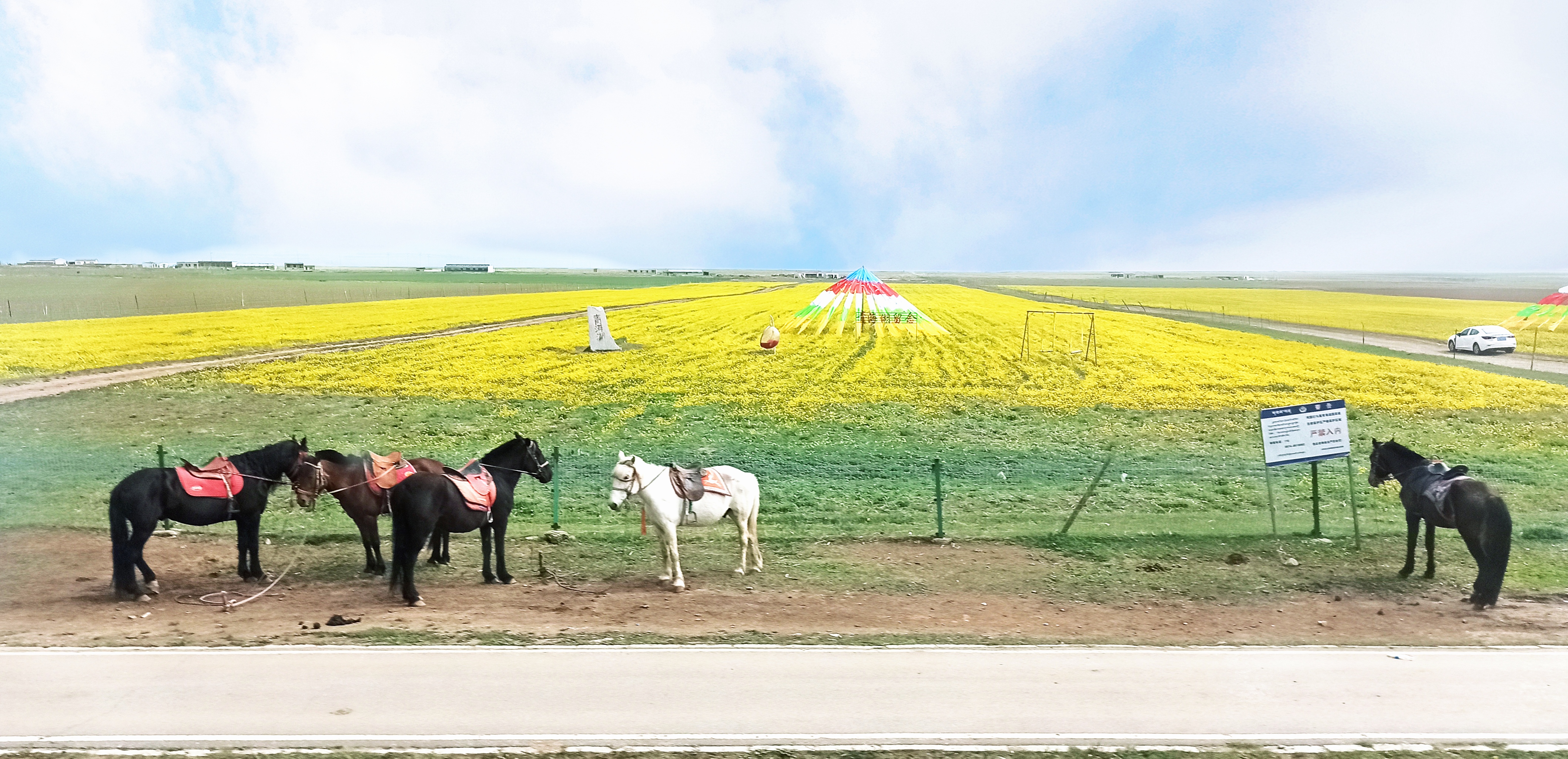 大巴车一路行驶在宛延曲直的天路——青藏公路上,沿途看不完的美景。导游告诉我们,此刻已行驶在柴达木盆地,果不虚传,平坦大地一望无际。蓝天白云、放养的马匹,牛羊还有那金黄色的油菜花,构成了一幅幅美丽大青海的图画。