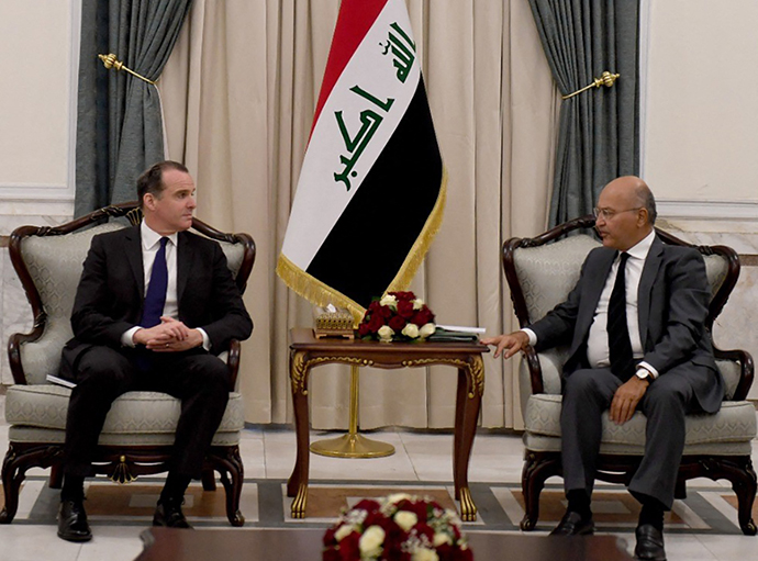 当地时间2021年7月15日,伊拉克巴格达,伊拉克总统巴尔哈姆·萨利赫与白宫中东事务协调员布雷特·麦高克会面。英国广播公司(BBC)记者Nafiseh Kohnavard在推特上宣称,美军将从伊拉克撤军。人民视觉 图
