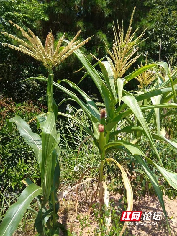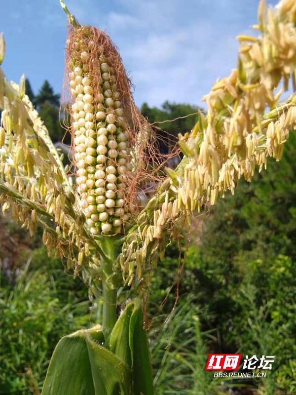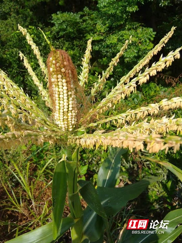 麻阳黄双乡与辰溪交界的一个村子最近火了,一村民地里有一颗玉米棒从玉米花中长出来。一般来说,玉米花开在玉米树顶部,玉米棒长在玉米树的杆上。这种变异现象引起村民的兴趣,90多岁老人说,这是他有生以来第一次见到。
