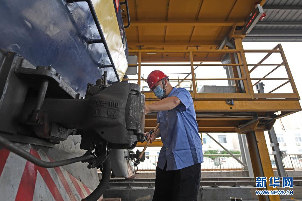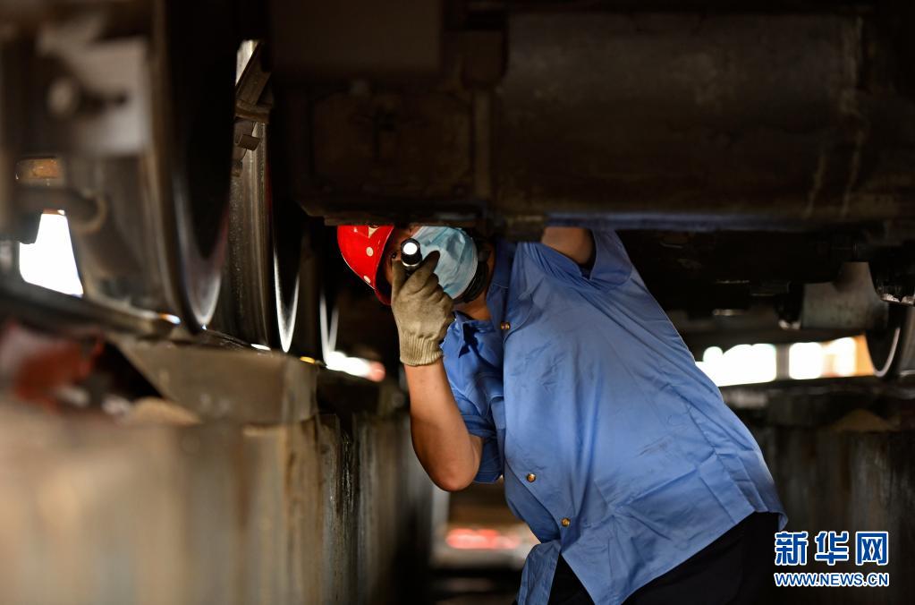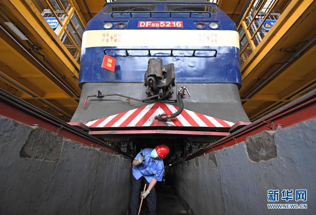 连日来,中国铁路北京局集团有限公司天津机务段员工冒着高温,忙碌在机车检修岗位上。机车检修人员对整备场中机车的机械室、车顶、车底、车轮进行检查作业,以保障机车的安全运行。