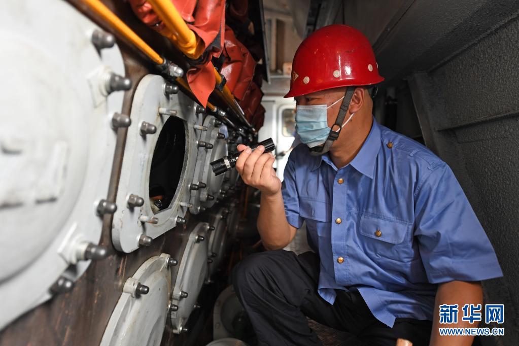 8月11日,在中国铁路北京局集团有限公司天津机务段检修车间,内燃机车检修工人对机车机械室进行检查作业。新华社记者 赵子硕 摄