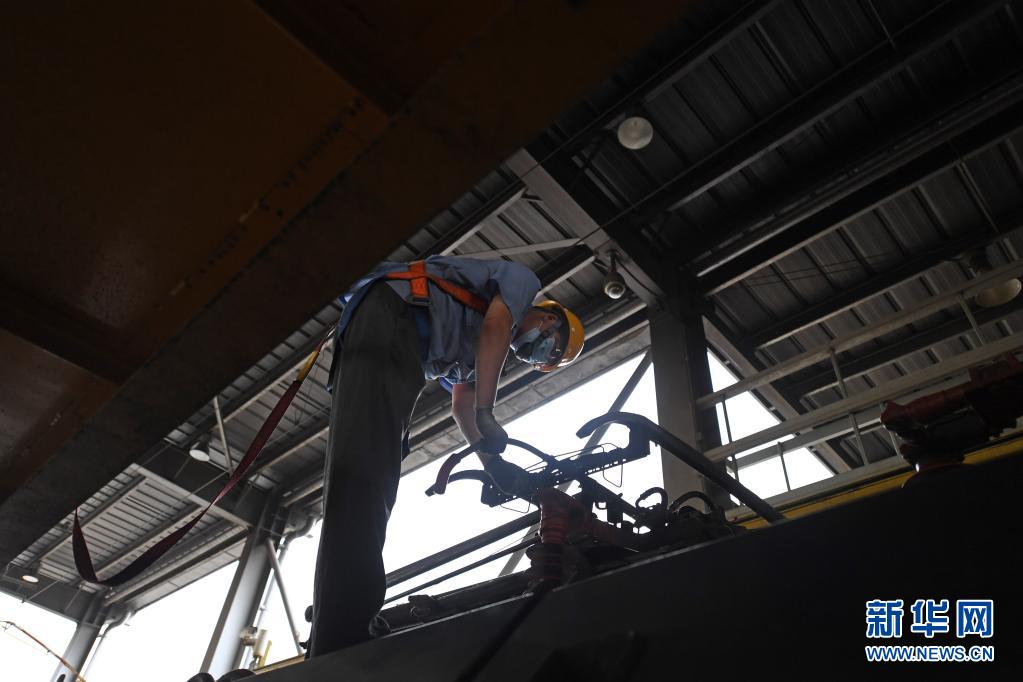 8月11日,在中国铁路北京局集团有限公司天津机务段检修车间,电力机车检修工人对机车车顶进行检查作业。新华社记者 赵子硕 摄