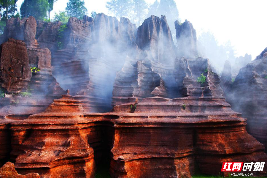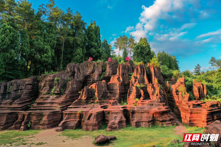 水刻红岩石成林,怒斩蛟龙染宫庭。